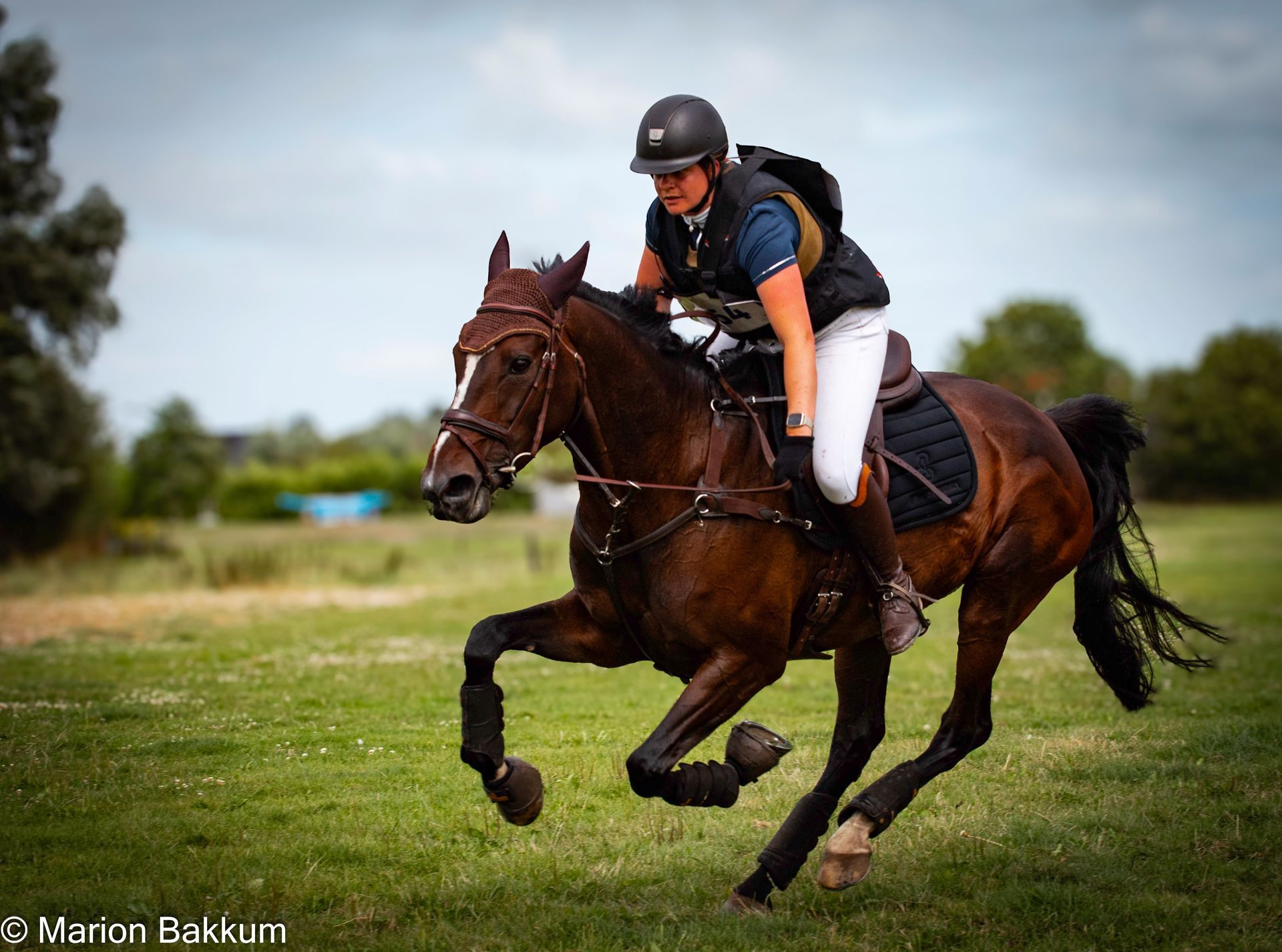 Een ruiter op een zwart paard springt over een hindernis tijdens een crosscountrywedstrijd.